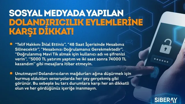 Bu kapsamda, başkanlıkça sosyal medya hesaplarından yapılan paylaşımda dolandırıcıların, "Telif hakkını ihlal ettiniz", "48 saat içerisinde hesabınız silinecektir", "Hesabınızı doğrulamanız gerekmektedir", "Doğrulanmış mavi tık almak için kullanıcı adı ve şifrenizi verin", "5 bin lira yatırım yaptım ve iki saat sonra 74 bin lira kazandım" gibi mesajlarla mağdurları ağına düşürdüğü belirterek, sosyal medya üzerinden gerçekleştirilen dolandırıcılık girişimlerinde mağdur olmamak için bu tür mesajlara itibar edilmemesi ve sosyal medya hesaplarının güvenliğinin sağlanması gerektiği vurgulandı.