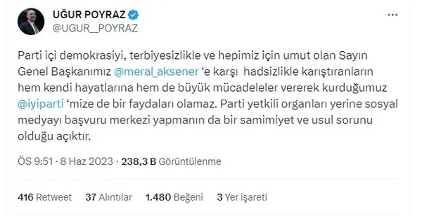 İYİ Parti Genel Sekreteri ve İYİ Parti Antalya Milletvekili Uğur Poyraz, seçim sonrasında hem parti içinde yaşanan eleştiriler hem de bu eleştirilerin sosyal medyaya taşınması sonrasında manifesto gibi bir açıklama yayınladı. Poyraz, Akşener'e karşı terbiyesizlik ve hadsizlik yapıldığını belirttiği açıklamasında "Parti içi demokrasiyi, terbiyesizlikle ve hepimiz için umut olan Sayın Genel Başkanımız Meral Akşener'e karşı hadsizlikle karıştıranların hem kendi hayatlarına hem de büyük mücadeleler vererek kurduğumuz İYİ Parti'mize de bir faydaları olamaz. Parti yetkili organları yerine sosyal medyayı başvuru merkezi yapmanın da bir samimiyet ve usul sorunu olduğu açıktır" ifadelerini kullandı.