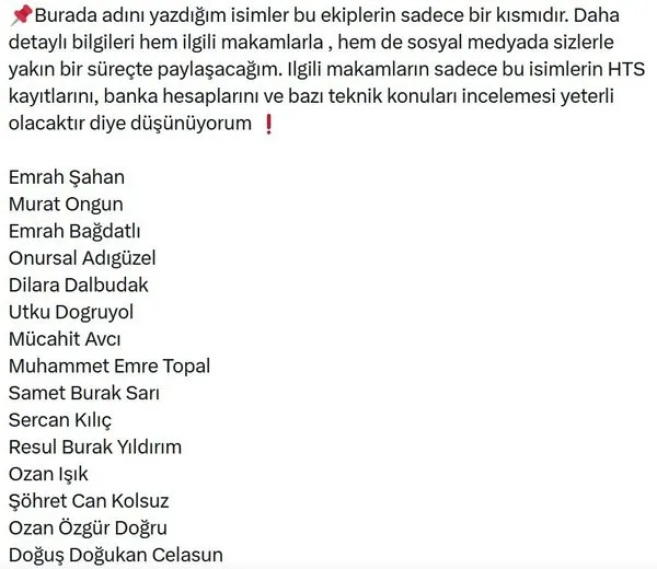 Burada adını yazdığım isimler bu ekiplerin sadece bir kısmıdır. Daha detaylı bilgileri hem ilgili makamlarla, hem de sosyal medyada sizlerle yakın bir süreçte paylaşacağım. İlgili makamların sadece bu isimlerin HTS kayıtlarını, banka hesaplarını ve bazı teknik konuları incelemesi yeterli olacaktır diye düşünüyorum.
