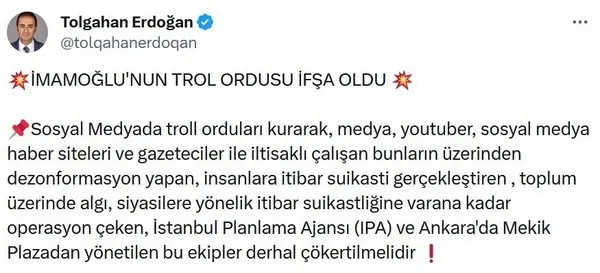 CHP’nin eski Genel Başkanı Kemal Kılıçdaroğlu'na yakınlığı ile bilinen CHP'li Tolga Erdoğan bu kez de partide Ekrem İmamoğlu'nun yönlendirdiği bir troll ordusunun olduğu iddiasında bulundu. Erdoğan sosyal medya hesabından yaptığı paylaşımda İstanbul Planlama Ajansı (IPA) ile Ankara'da Mekik Plazadan yönetilen ve sosyal medyada itibar suikasti düzenleyen isimleri tek tek yazdı.