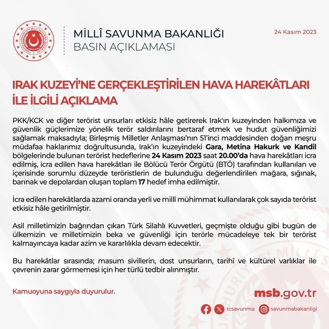 Milli Savunma Bakanlığı, Irak'ın kuzeyine düzenlenen hava harekatında 17 terör hedefini imha edildiğini bildirdi.