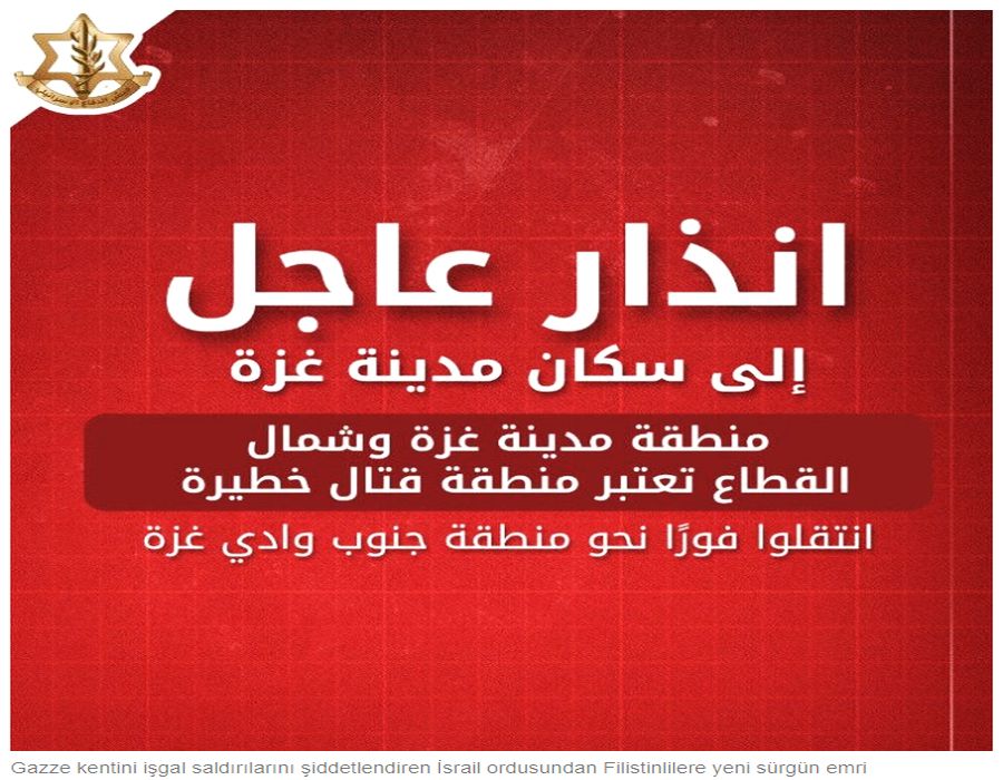 İsrail ordusu, Gazze kentini işgal için gece boyu düzenlediği şiddetli saldırılarının ardından Gazze kentindeki Filistinlilere yeni sürgün emri yayımladı.