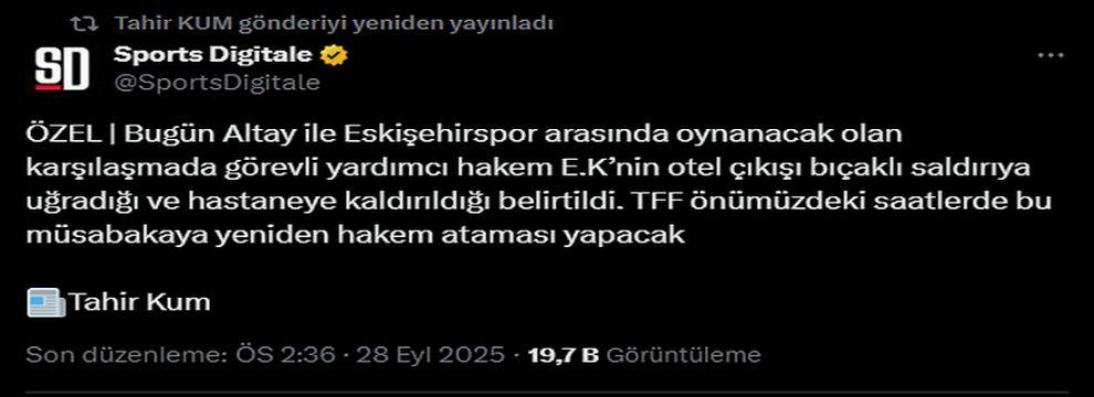 Tahir Kum haberinde "Bugün Altay ile Eskişehirspor arasında oynanacak olan karşılaşmada görevli yardımcı hakem E.K’nin otel çıkışı bıçaklı saldırıya uğradığı ve hastaneye kaldırıldığı belirtildi. TFF önümüzdeki saatlerde bu müsabakaya yeniden hakem ataması yapacak" ifadelerini kullandı.
