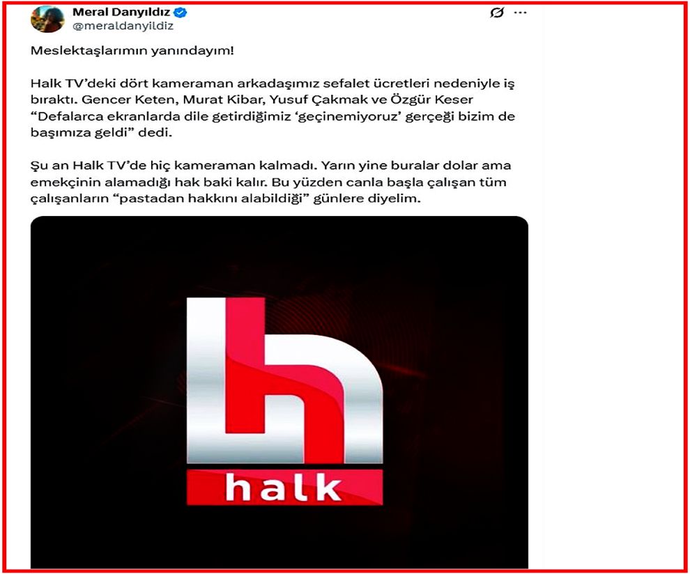Meral Danyıldız; Gencer Keten, Murat Kibar, Yusuf Çakmak ve Özgür Keser’in “Defalarca ekranlarda dile getirdiğimiz ‘geçinemiyoruz’ gerçeği bizim de başımıza geldi” ifadelerini paylaştığını aktardı. Açıklamada, şu an Halk TV’de hiç kameraman kalmadığı belirtilirken, Danyıldız, “Yarın yine buralar dolar ama emekçinin alamadığı hak baki kalır. Bu yüzden canla başla çalışan tüm çalışanların pastadan hakkını alabildiği günlere diyelim” ifadelerini kullandı.