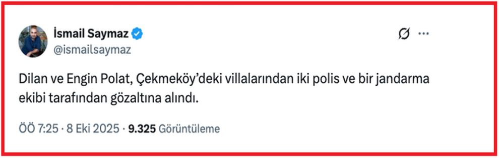 Dilan ve Engin Polat çifti, sabah saatlerinde Çekmeköy’deki villalarına düzenlenen baskında gözaltına alındı. Gelişmeyi gazeteci İsmail Saymaz sosyal medya hesabından duyurdu.