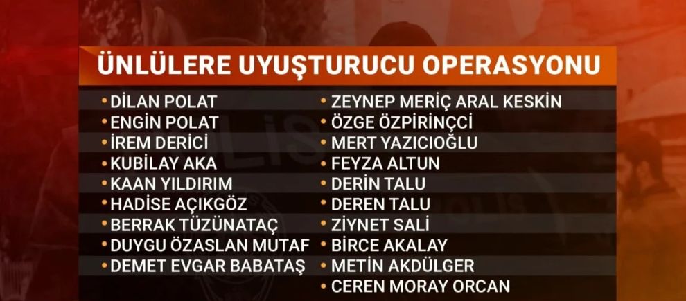 İstanbul İl Jandarma Komutanlığı ekiplerince gerçekleştirilen operasyonda, aralarında Dilan Polat, Engin Polat, İrem Derici, Kubilay Aka, Kaan Yıldırım, Hadise Açıkgöz, Berrak Tüzünataç, Duygu Özaslan Mutaf, Demet Evgar Babataş, Zeynep Meriç Aral Keskin, Özge Özpirinçci, Mert Yazıcıoğlu, Feyza Altun, Derin Talu, Deren Talu, Ziynet Sali, Birce Akalay, Metin Akdülger, Ceren Moray Orcan’ın da bulunduğu şüpheliler, ifadeleri ve kan örneklerinin alınması amacıyla İl Jandarma Komutanlığı’na götürüldü.