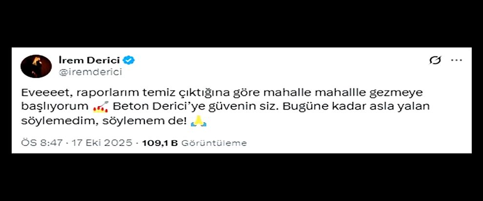 Derici, "Eveeeet, raporlarım temiz çıktığına göre mahalle mahalle gezmeye başlıyorum. Beton Derici’ye güvenin siz. Bugüne kadar asla yalan söylemedim, söylemem de!" ifadelerini kullandı.