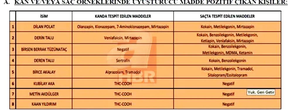 Gerekli tahlillerin yapılması amacıyla Adli Tıp Kurumu'na götürülen kişilerden saç ve kan örnekleri alındı. Testleri alınan 19 kişiden 8 kişinin testinin pozitif olduğu tespit edildi. Testi pozitif çıkan isimlerin Dilan Polat, Derin Talu, Deren Talu, Birsen Berrak Tüzünataç, Birce Akalay, Kubilay Aka, Metin Akdülger, Kaan Yıldırım olduğu öğrenildi.