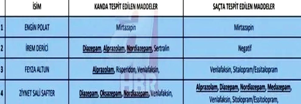 Kanında ilaç etken maddesi tespit edilen ünlüler: Engin Polat, İrem Derici, Feyza Altun ve Ziynet Sali Safter olarak açıklandı. Derici, Altun ve Sali'nin ilaçlarının yeşil reçete ile alındığı ifade edildi.