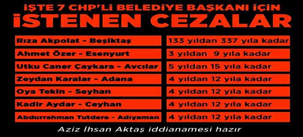 İddianamede, görevlerinden uzaklaştırılan Seyhan Belediye Başkanı şüpheli Oya Tekin, Ceyhan Belediye Başkanı şüpheli Kadir Aydar, Adana Büyükşehir Belediye Başkanı şüpheli Zeydan Karalar, Adıyaman Belediye Başkanı Abdurrahman Tutdere'nin "rüşvet alma" suçundan 4'er yıldan on ikişer yıla kadar hapisle cezalandırılması talep edildi.