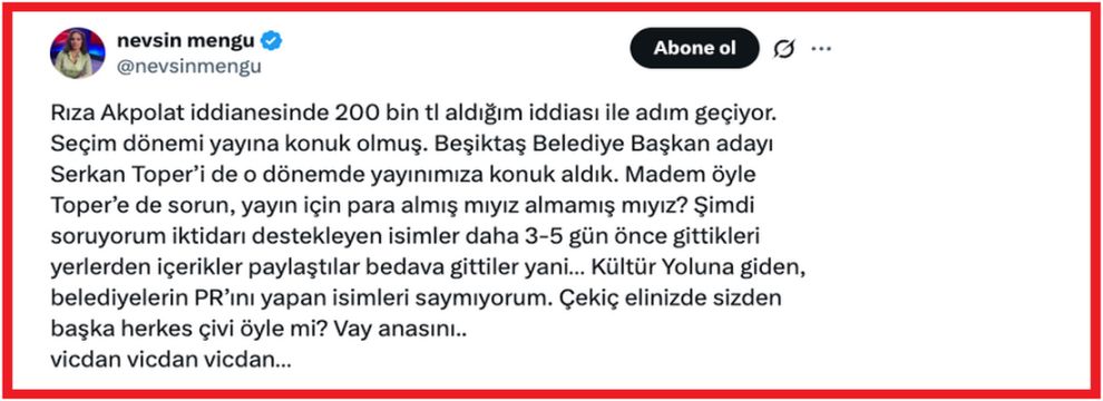 ''Rıza Akpolat iddianesinde 200 bin tl aldığım iddiası ile adım geçiyor. Seçim dönemi yayına konuk olmuş. Beşiktaş Belediye Başkan adayı Serkan Toper’i de o dönemde yayınımıza konuk aldık. Madem öyle Toper’e de sorun, yayın için para almış mıyız almamış mıyız? Şimdi soruyorum iktidarı destekleyen isimler daha 3-5 gün önce gittikleri yerlerden içerikler paylaştılar bedava gittiler yani… Kültür Yoluna giden, belediyelerin PR’ını yapan isimleri saymıyorum. Çekiç elinizde sizden başka herkes çivi öyle mi? Vay anasını.. vicdan vicdan vicdan…''
