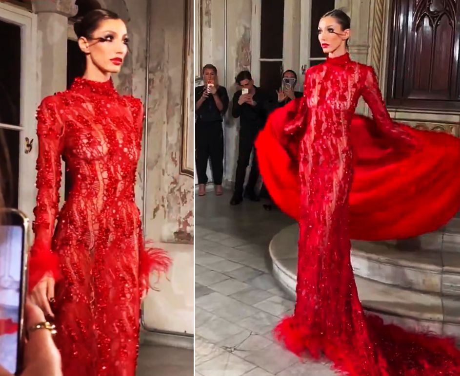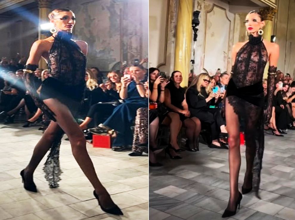 Efe Batur’un “La Nuit Rouge” adlı defilesinde podyuma çıkan Şahin'in cesur seçimleriyle geceye damga vurdu.