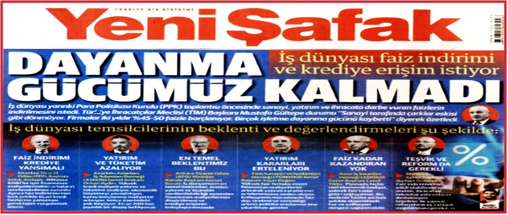 Bugün 'İş dünyası faiz indirimi ve krediye erişim istiyor Dayanacak gücümüz kalmadı' başlığı ile çıkan Yeni Şafak, iş dünyası temsilcilerinin beklenti ve değerlendirmelerini sıraladı.