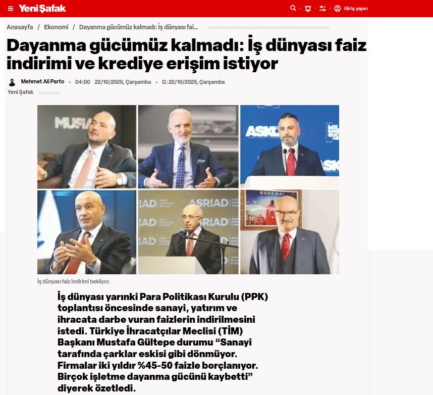 TİM Başkanı Mustafa Gültepe, Merkez Bankası'nın faiz indirimlerinde artık çok daha cesur davranması bekleniyor diye görüş bildirdi. TÜMSİAD Başkanı Yaşar Doğan, üretimi desteklerken makro dengeyi gözeten faiz politikasının büyük önem taşıdığını, faizsiz finansman enstrümanlarının yaygınlaşması gerektiğini söyledi.
