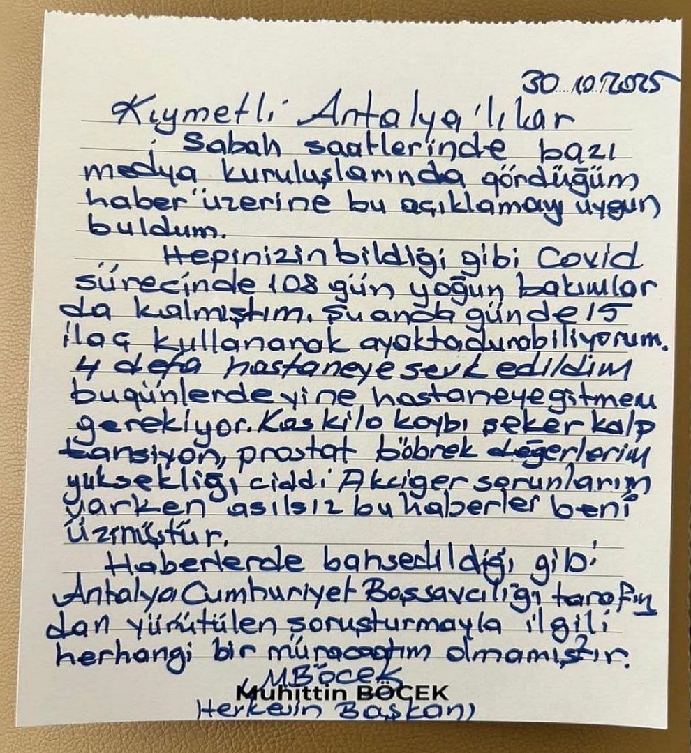 Antalya Büyükşehir Belediyesi'ne yönelik yürütülen soruşturmalar kapsamında tutuklanan Muhittin Böcek'in, etkin pişmanlıktan faydalanabilmek için Antalya Cumhuriyet Başsavcılığı'na başvuru yaptığı iddia edilmişti.