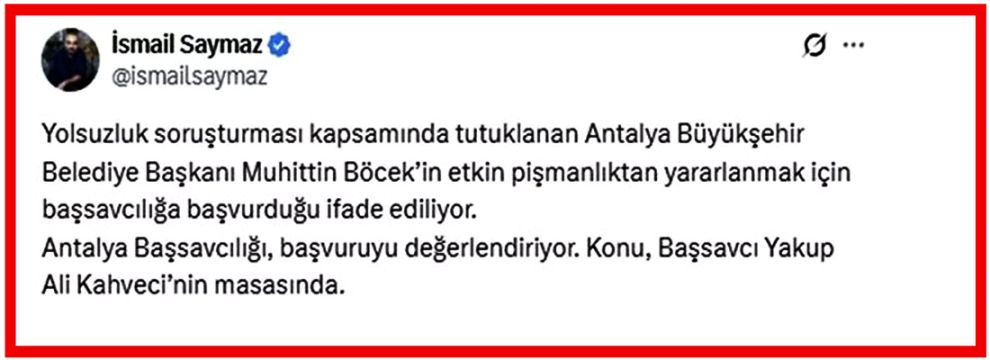Gazeteci İsmail Saymaz, X hesabından yaptığı paylaşımda "Yolsuzluk soruşturması kapsamında tutuklanan Antalya Büyükşehir Belediye Başkanı Muhittin Böcek’in etkin pişmanlıktan yararlanmak için başsavcılığa başvurduğu ifade ediliyor. Antalya Başsavcılığı, başvuruyu değerlendiriyor. Konu, Başsavcı Yakup Ali Kahveci’nin masasında” ifadelerini kullandı.