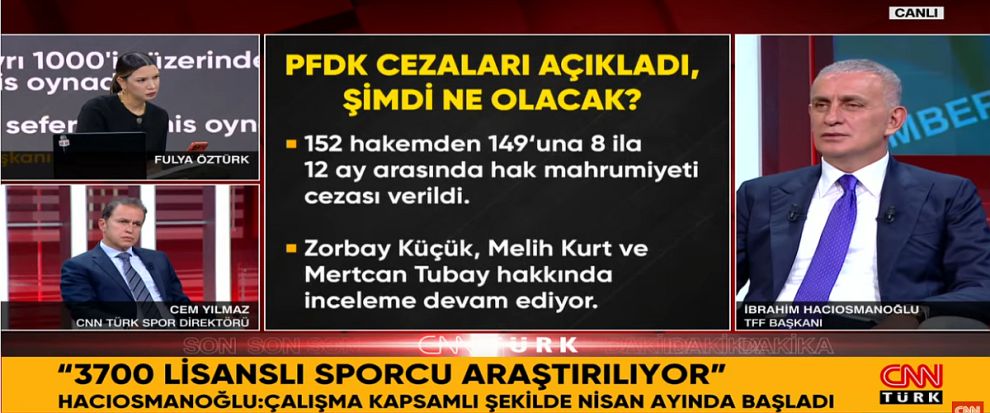 "Nisan ayında kapsamlı bir araştırma yapıldı. Ankaraspor - Nazilli maçı skoru iki takımın da işine yarıyordu. Arkadaşlarımızla ivedilikle bu işe koyulmasını istedik. İki taraftan da maça bahis oynanmış. Bizim tarafımızdan üst sınırdan ceza verildi. Sonra arkadaşlarıma bu araştırmaya gerçek manada başlayalım dedim. Biz 15 tane hakem bekliyorduk ama bu rakamlar çıkınca üzüldüm tabii. Sırada futbolcular var, 3 bin 700 kişi inceleniyor."