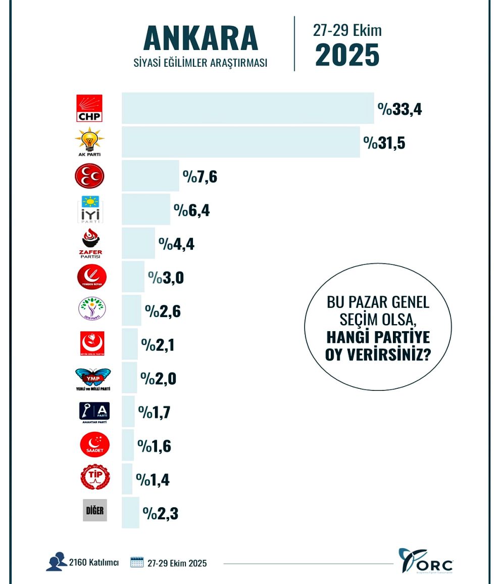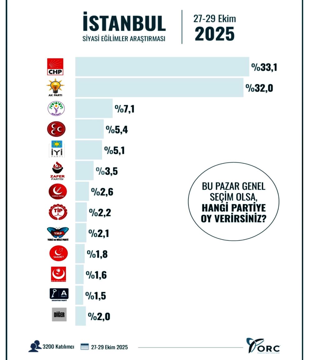 ORC Araştırma, son anket çalışmasında "Bu pazar genel seçim olsa, hangi partiye oy verirsiniz?" sorusunu yöneltti. İstanbul ve Ankara’da yapılan ölçümde dikkat çeken sonuçlar ortaya çıktı. Peki CHP ile AK Parti arasındaki oy farkı ne kadar?