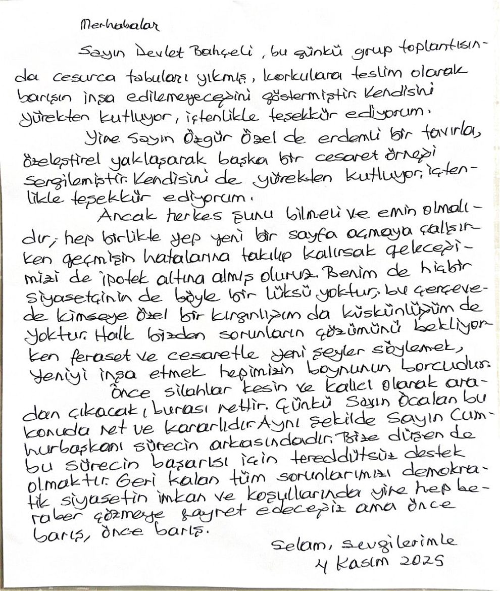 "Sayın Devlet Bahçeli, bugünkü grup toplantısında cesurca tabuları yıkmış, korkulara teslim olarak barışın inşa edilemeyeceğini göstermiştir. Kendisini yürekten kutluyor, içtenlikle teşekkür ediyorum. Yine Sayın Özgür Özel de erdemli bir tavırla, özeleştirel yaklaşarak başka bir cesaret örneği sergilemiştir. Kendisini de yürekten kutluyor, içtenlikle teşekkür ediyorum."