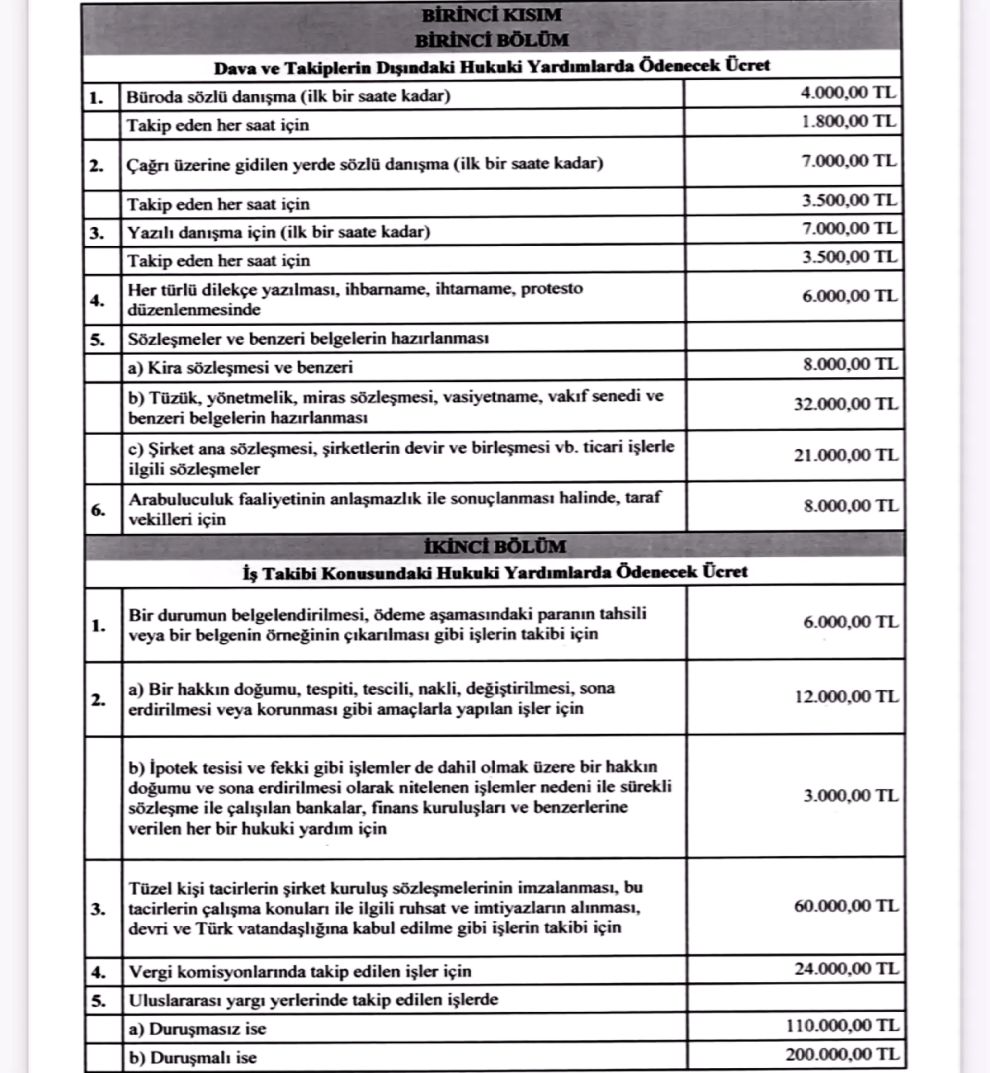 Avukatlık bürosunda sözlü danışma ücreti ilk 1 saat için 4 bin TL, sonraki her 1 saat için bin 800 TL olarak belirlendi. Çağrı üzerine gidilen yerde 1 saate kadar sözlü danışma ücreti ise 7 bin TL oldu.