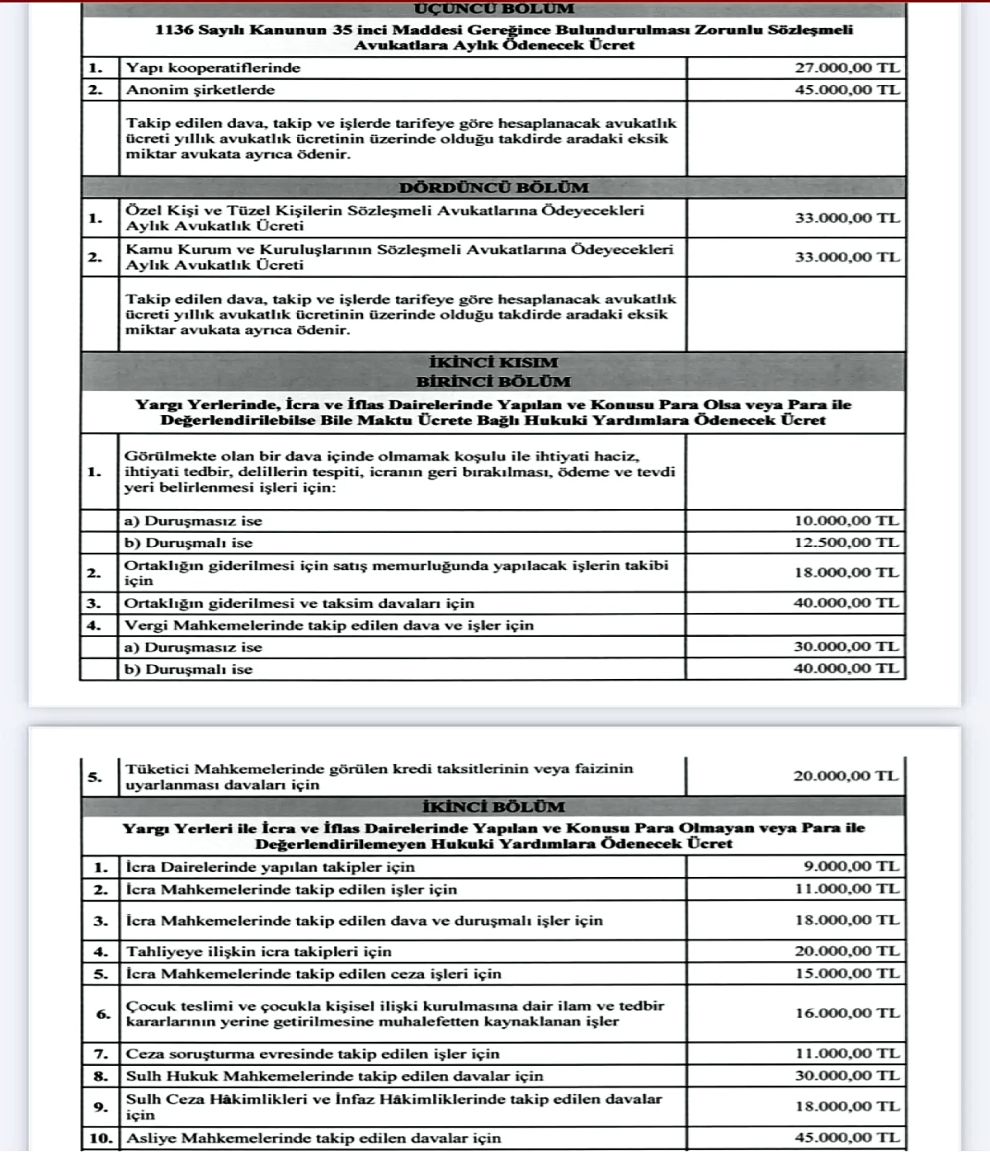 Resmi Gazete’de yayımlanan yeni Avukatlık Asgari Ücret Tarifesi’ne göre, kamu kurumları ve özel şirketlerin sözleşmeli avukatlarına ödenecek en az ücret 33 bin TL olarak belirlendi. Türkiye Barolar Birliği, tarifede ortalama yüzde 36,15 oranında artış yapıldığını duyurdu.