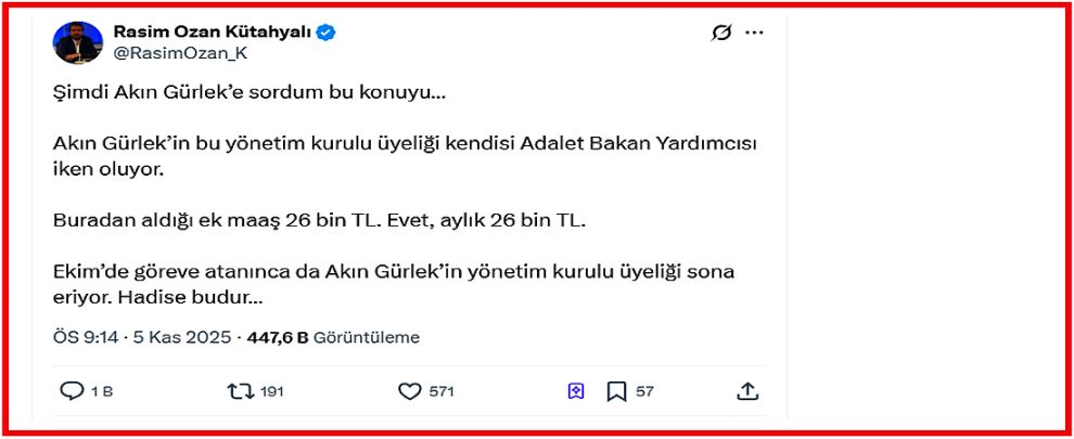 Televizyon yorumcusu Rasim Ozan Kütahyalı, CHP lideri Özgür Özel'in İstanbul Cumhuriyet Başsavcısı Akın Gürlek ile ilgili, "2 Ekim 2024'te bu göreve (başsavcılık) atanıyor, ardından 29 Kasım 2024'te Eti Maden'in Lüksemburg'daki şirketine Akın Gürlek yönetim kurulu üyesi olarak atanıyor. Ekrem başkanı tutukladığı günün de içinde olduğu 9 ay boyunca buralardan maaşlarını alıyor. Apar topar 6 Ağustos 2025’te yönetim kurulu üyeliğinden ayrılıyor" iddiasını Gürlek'e sorduğunu duyurdu.