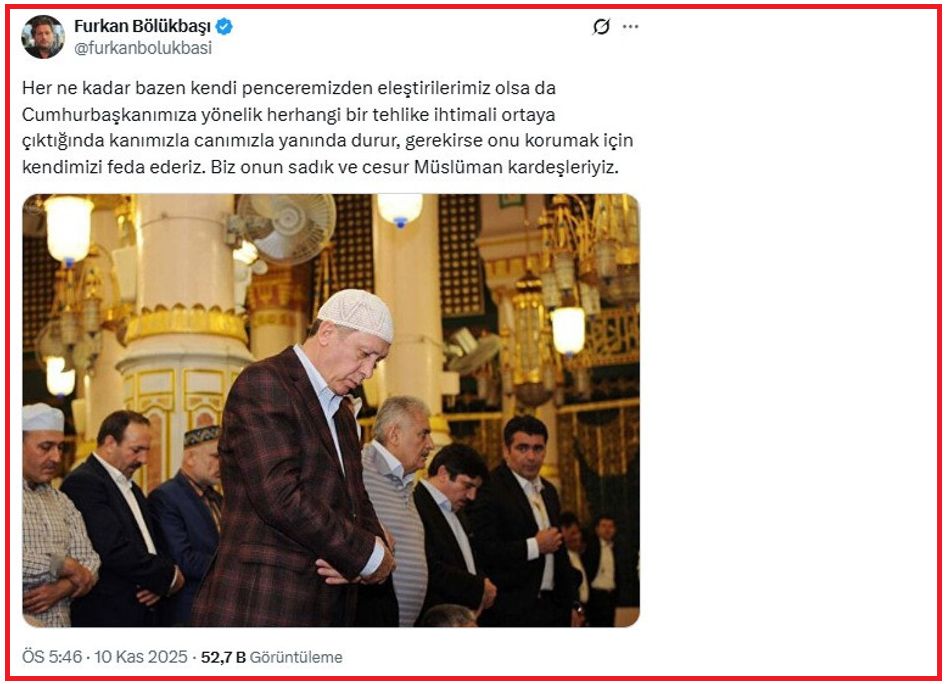 Daha sonra paylaşımını silen Bölükbaşı, yeni paylaşımında Erdoğan'ın namaz kıldığı bir fotoğrafı paylaşarak, "Her ne kadar bazen kendi penceremizden eleştirilerimiz olsa da Cumhurbaşkanımıza yönelik herhangi bir tehlike ihtimali ortaya çıktığında kanımızla canımızla yanında durur, gerekirse onu korumak için kendimizi feda ederiz. Biz onun sadık ve cesur Müslüman kardeşleriyiz" ifadelerini kullandı.