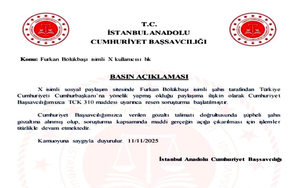 AK Parti'ye yakınlığıyla bilinen sosyal medya kullanıcısı Furkan Bölükbaşı, bir sosyal medya kullanıcısının "10 Kasım 2025 tarihli M.Kemal'in ölüm yıldönümü resmi merasimini biraz takip ettim. Tayyip Erdoğan ile Adalet ve Kalkınma Partisine hikmet-i ilahiye gereği çok sağlam bir yenilgi tattırılacağı kanaatim kuvvetlendi..." şeklindeki paylaşımını alıntılayarak, "Menderes'in sonunu Kemalizme yaptığı şirinlikler getirmişti. İnşallah Müslümanların mevcut iktidarı da aynı akıbete uğramadan kendine çeki düzen verir" yazdı. Söz konusu paylaşımını kısa sürede gündem oldu.