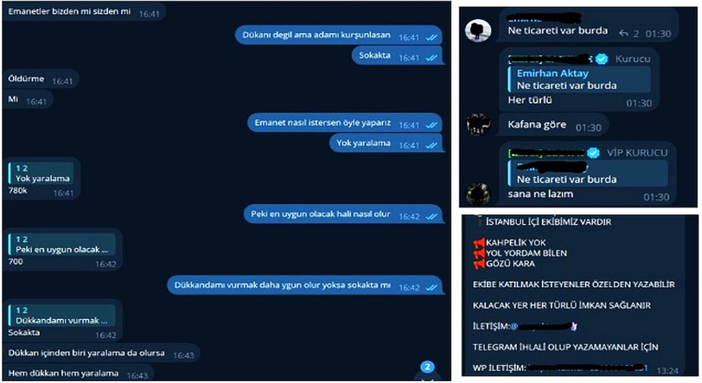 Çeşitli platformlarda “yeni nesil suç örgütleri” adlarıyla yapılan aramalarda, doğrudan “her ilde suikast”, “mekân kurşunlama”, “her iş yapılır” gibi anahtar kelimelerle onlarca paylaşım bulunabiliyor. Bu kanallardaki paylaşımlar herhangi şifreli dile sahip değil. İletişime geçilen bir kullanıcı, “Emanetin kimden olacağına göre fiyat değişir” diyerek cinayet veya ağır yaralama tekliflerini kabul ettiklerini iddia etti.