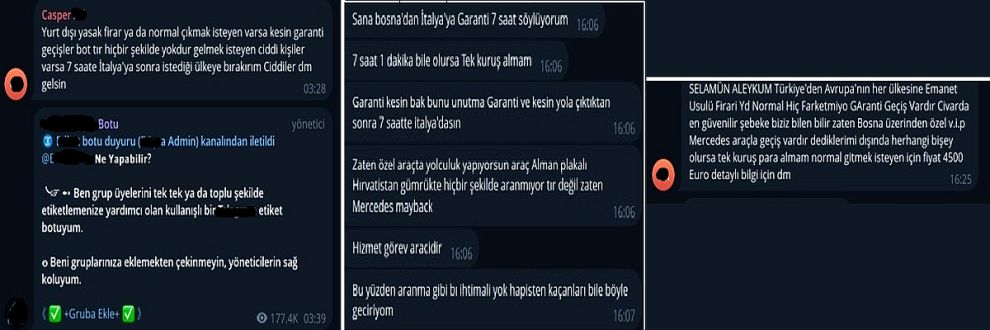 İnternette yapılan başka bir aramada ise “geçiş garantili” ifadesiyle paylaşılan ‘insan kaçakçılığı’ ilanına ulaşıldı. Türkiye üzerinden Bosna Hersek’e havayoluyla ulaşım sağlandıktan sonra “Almanya’ya ait hizmet görev aracıyla” Avrupa’nın her yerine geçiş vaat eden bu hesap, kişi başı 4 bin 500 Euro talep etti. Grup olarak gelindiğinde grup indirimi yapılacağı belirtilirken, 14 yıllık tecrübeye sahip olduklarını ekledi.