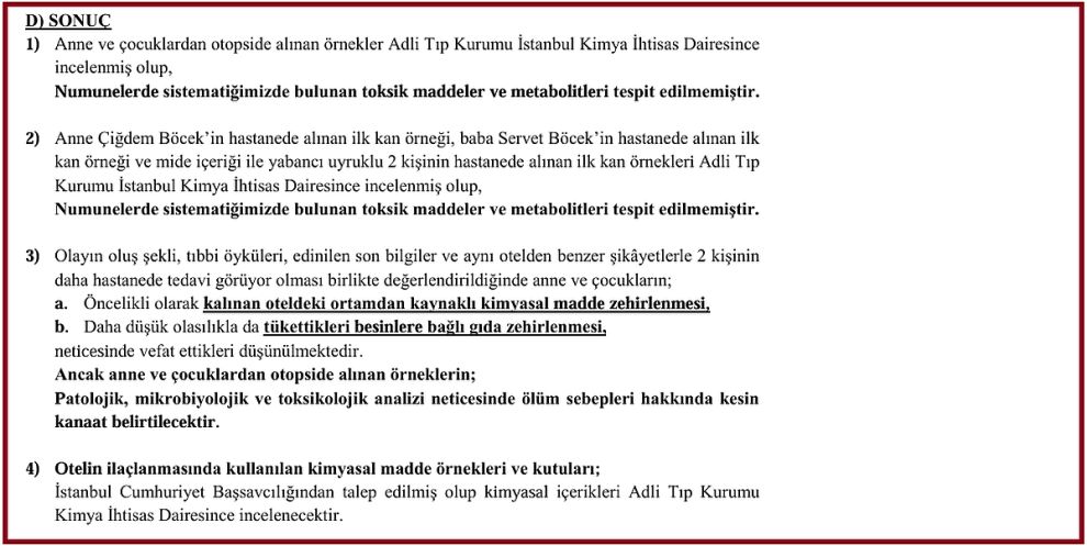 Ayrıca; otel ilaçlaması yapılırken kullanılan kimyasal maddeler ve kutuları, anne Çiğdem Böcek’in hastanede alınan ilk kan örneği, baba Servet Böcek’in hastanede alınan ilk kan örneği ve mide içeriği, yabancı uyruklu 2 kişinin hastanede alınan ilk kan örnekleri, İstanbul Cumhuriyet Başsavcılığı tarafından incelenmek üzere Adli Tıp Kurumuna gönderilmiştir."