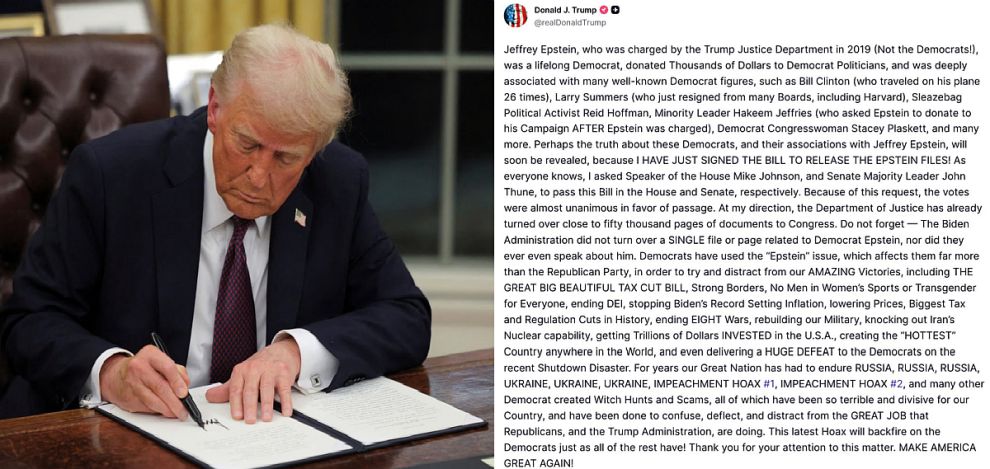 ABD Başkanı Donald Trump, sosyal medya hesabından yaptığı paylaşımda Kongre'nin onaylayarak Beyaz Saray'a gönderdiği "Epstein Dosyaları Şeffaflık Yasası" adlı tasarıyı imzaladığını açıkladı. Trump, Epstein olayıyla kendisinin değil, eski ABD Başkanı Bill Clinton başta olmak üzere bazı ünlü Demokratların ilgisinin olduğunu ve dosyaların açıklanmasıyla bu gerçeklerin tamamen ortaya çıkacağını savundu.