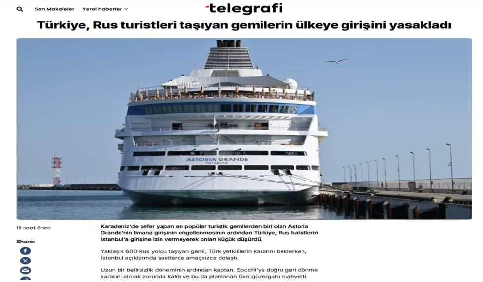 Astoria Grande adlı Rus kruvaziyerinin İstanbul’a yanaşmasına izin verilmedi ve gemi yüzlerce yolcusuyla Soçi’ye geri döndü. Rus basını kararın Trabzon’da bir Türk feribotuna uygulanan engellemenin karşılığı olduğunu öne sürdü. Yolculara turlar iade edildi ve şirket bir sonraki seyahat için indirim kuponu dağıttı. Sarayburnu’na yanaşma izni verilmeyen Rus kruvaziyer rotasını değiştirdi ve Karadeniz’e doğru hareket etti.