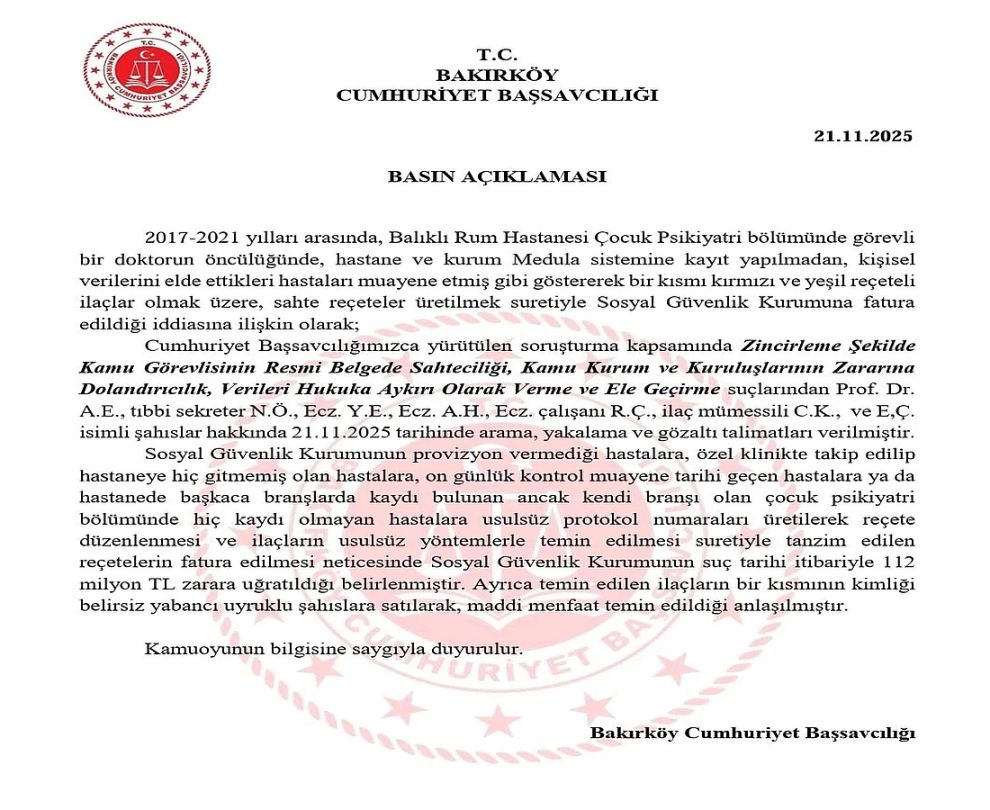 "2017–2021 yılları arasında, Balıklı Rum Hastanesi Çocuk Psikiyatri bölümünde görevli bir doktorun öncülüğünde, hastane ve kurum Medula sistemine kayıt yapılmadan, kişisel verilerini elde ettikleri hastaları muayene etmiş gibi göstererek bir kısım kırmızı ve yeşil reçeteli ilaçlar olmak üzere, sahte reçeteler üretilmek suretiyle Sosyal Güvenlik Kurumuna fatura edildiği iddiasına ilişkin olarak;