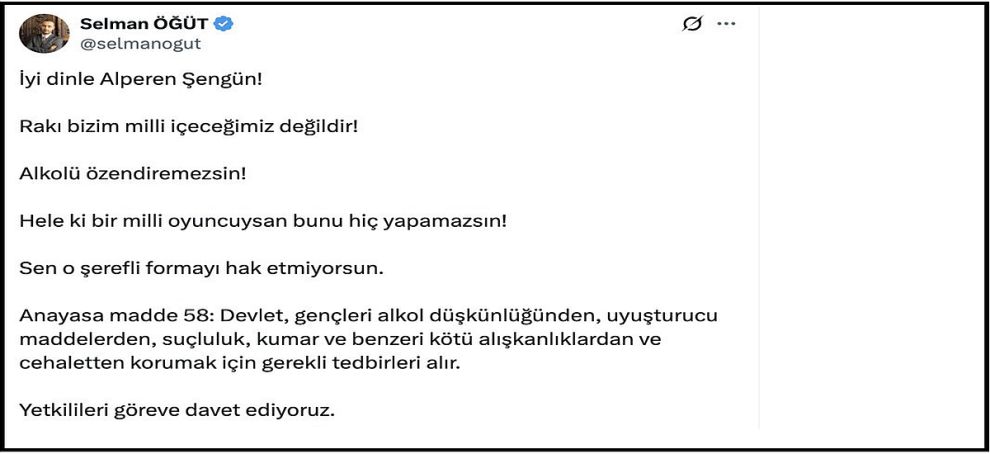 Selman Öğüt, Alperen Şengün’ün videosunu paylaşarak hedef aldı. Öğüt paylaşımında, “İyi dinle Alperen Şengün! Rakı bizim milli içeceğimiz değildir! Alkolü özendiremezsin! Hele ki bir milli oyuncuysan bunu hiç yapamazsın! Sen o şerefli formayı hak etmiyorsun. Anayasa madde 58: Devlet, gençleri alkol düşkünlüğünden, uyuşturucu maddelerden, suçluluk, kumar ve benzeri kötü alışkanlıklardan ve cehaletten korumak için gerekli tedbirleri alır. Yetkilileri göreve davet ediyoruz” dedi.