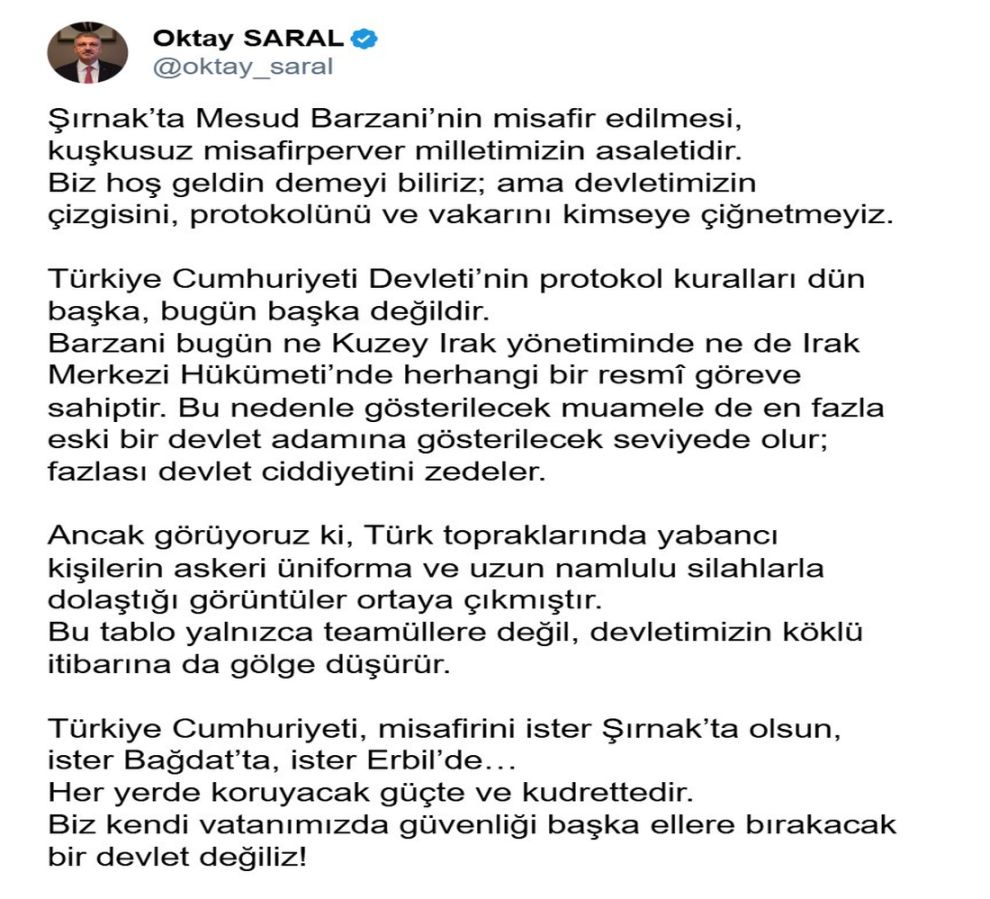 Saral şöyle devam etti: "Barzani bugün ne Kuzey Irak yönetiminde ne de Irak Merkezi Hükümeti’nde herhangi bir resmî göreve sahiptir. Bu nedenle gösterilecek muamele de en fazla eski bir devlet adamına gösterilecek seviyede olur; fazlası devlet ciddiyetini zedeler. Ancak görüyoruz ki, Türk topraklarında yabancı kişilerin askeri üniforma ve uzun namlulu silahlarla dolaştığı görüntüler ortaya çıkmıştır.