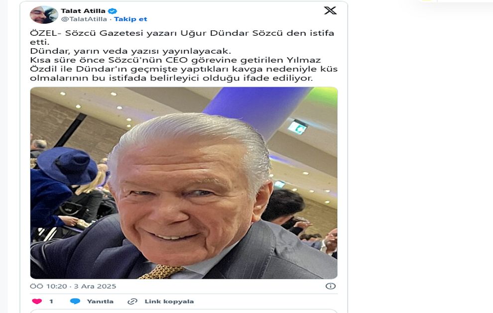 Uğur Dündar’ın Sözcü Gazetesi’nden istifa ettiği iddia edildi. Haberi, gazeteci Talat Atilla sosyal medya hesabından duyurdu. Atilla, paylaşımında Dündar’ın yarın Sözcü’de bir “veda yazısı” kaleme alacağını belirtti.