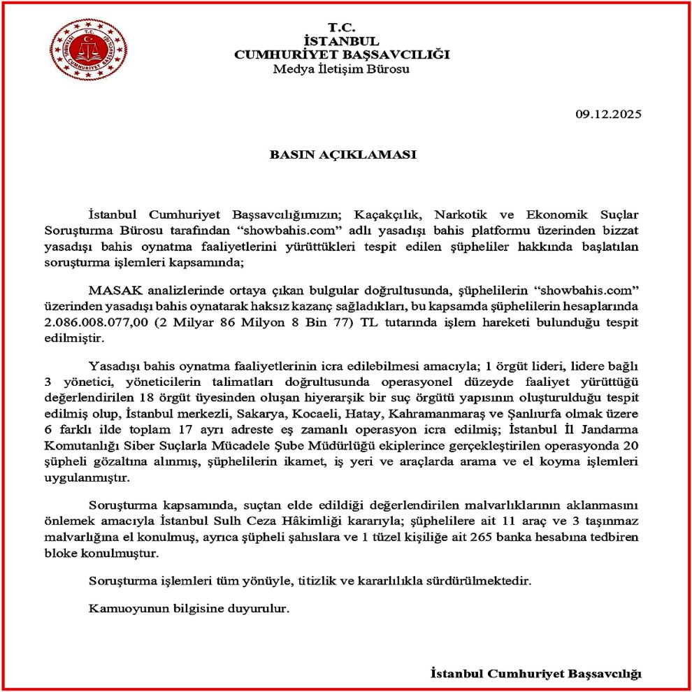 "İstanbul Cumhuriyet Başsavcılığımızın; Kaçakçılık, Narkotik ve Ekonomik Suçlar Soruşturma Bürosu tarafından "showbahis.com" adlı yasadışı bahis platformu üzerinden bizzat yasadışı bahis oynatma faaliyetlerini yürüttükleri tespit edilen şüpheliler hakkında başlatılan soruşturma işlemleri kapsamında;
