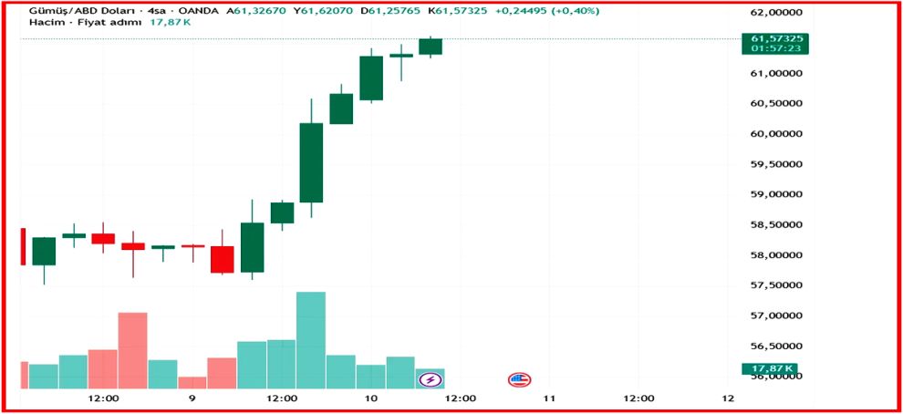 Uluslararası piyasalarda gümüş ons fiyatı 61,62 dolara kadar çıkarak tüm zamanların en yüksek seviyesini gördü.
