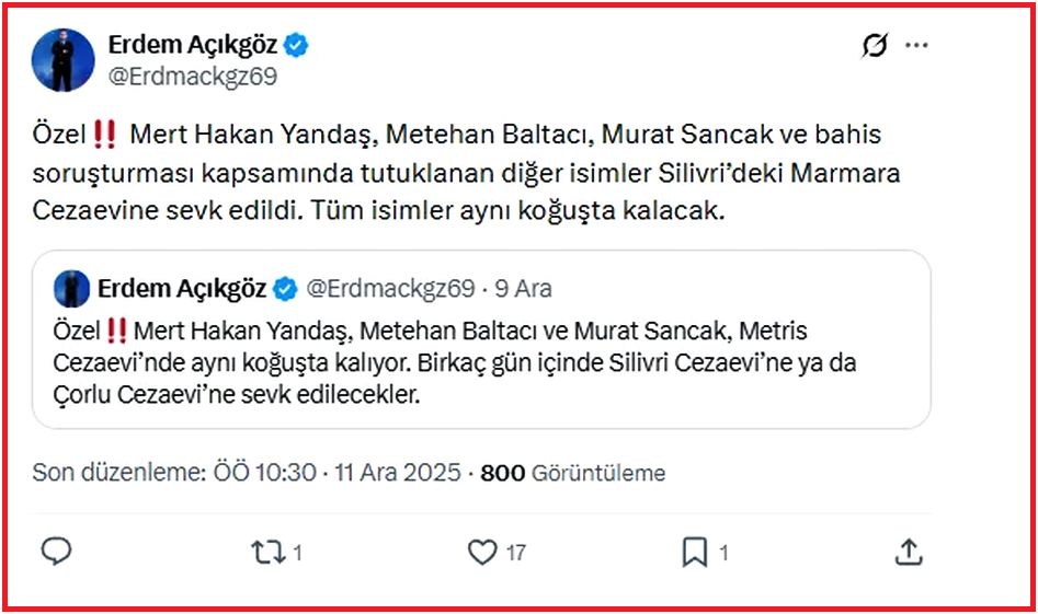 Sevk edilen isimlerin Marmara Cezaevi’nde aynı koğuşta kalacağı öğrenildi. Bu karar, soruşturma sürecinde birlikte tutulan futbolcular ve spor yöneticileri açısından dikkat çekici bir gelişme olarak değerlendiriliyor.