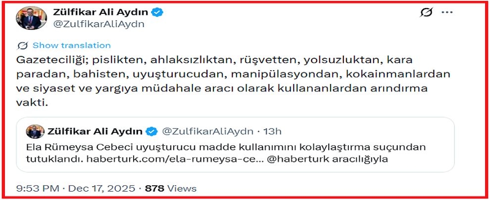 Uyuşturucu soruşturması kapsamında tutuklanan Ela Rumeysa Cebeci’nin cezaevine gönderilmesinin ardından Habertürk Haber Koordinatörü Zülfikar Ali Aydın sosyal medyadan dikkat çeken bir mesaj yayımladı.