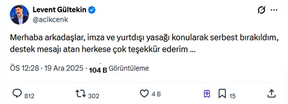 Savcılık ifadesi alınmadan dosya üzerinden adli kontrol istemiyle Sulh Ceza Hâkimliği’ne sevk edilen Gültekin, imza yükümlülüğü ve yurt dışı çıkış yasağı şartıyla serbest bırakıldı.