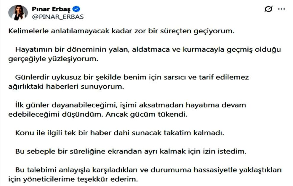 Tanınan spiker açıklamasında, yaşadığı sürecin ağırlığı nedeniyle bir süreliğine ekranlardan uzak kalacağını belirtti. Erbaş, “Kelimelerle anlatılamayacak kadar zor bir süreçten geçiyorum. Hayatımın bir döneminin yalan, aldatmaca ve kurmacayla geçmiş olduğu gerçeğiyle yüzleşiyorum. Günlerdir uykusuz bir şekilde benim için sarsıcı ve tarif edilemez ağırlıktaki haberleri sunuyorum” ifadelerini kullandı.