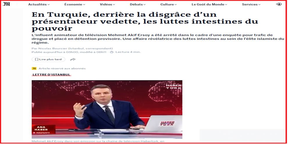 Fransız basını Le Monde, eski Habertürk Genel Yayın Yönetmeni Mehmet Akif Ersoy’un tutuklanmasına ilişkin "Türkiye'de, ünlü bir sunucunun gözden düşmesinin ardında, iktidar mücadeleleri yatıyor" başlığıyla bir haber yayınladı. Haberde, Ersoy dosyasının "iktidar içindeki İslamcı elitler arasında yaşanan güç mücadelesine dair ipuçları taşıdığı" kaydedildi.