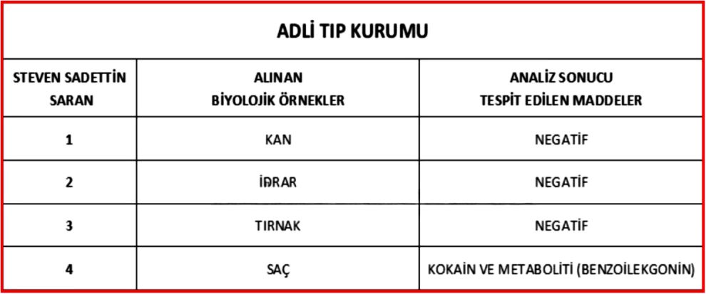 Uyuşturucu soruşturması kapsamında, Adli Tıp Kurumu'na sevk edilen Fenerbahçe Spor Kulübü Başkanı Sadettin Saran'ın saç örneğinde yapılan incelemede 'kokain pozitif' olduğu belirlendi. Rapor İstanbul Cumhuriyet Başsavcılığı'na gönderildi.
