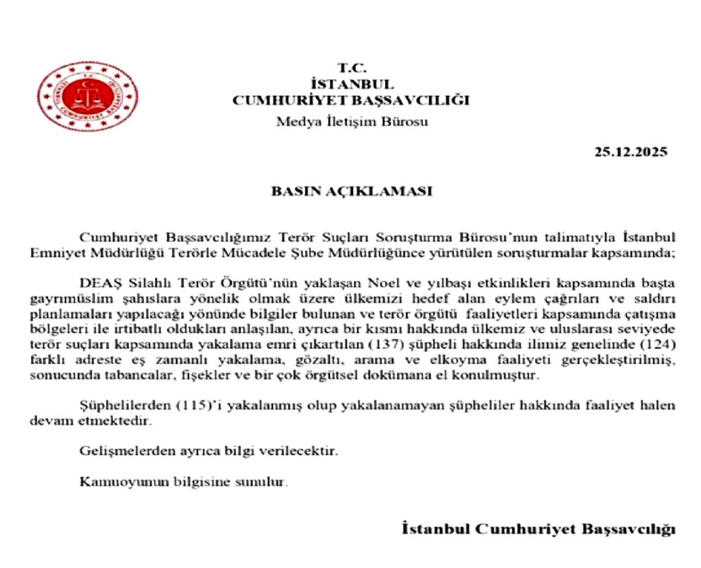 İstanbul Cumhuriyet Başsavcılığı Noel ve yılbaşında saldırı hazırlığında olan terör örgütü IŞİD mensuplarına operasyon düzenlendiğini açıkladı. 137 kişi IŞİD'li için gözaltı kararı çıkartılırken 115'i yakalandı.