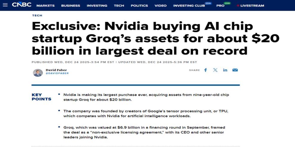 Yapay zekâ çipleri pazarında başı çeken Nvidia’nın, yüksek performanslı yapay zekâ hızlandırıcılarıyla tanınan ABD merkezli Groq’u yaklaşık 20 milyar dolarlık nakit bir anlaşmayla satın almak üzere mutabakata vardığı öne sürüldü.