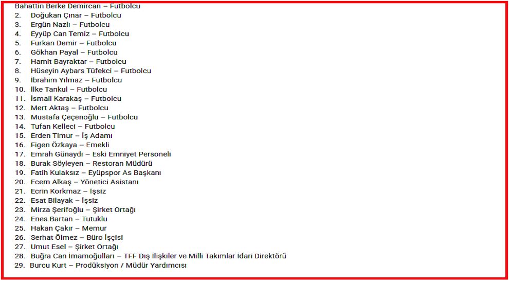 Hakkında gözaltı kararı verilenler arasında, Eski Galatasaray Spor Kulübü yöneticisi Erden Timur, Eyüpspor As Başkanı Fatih Kulaksız, futbolcular Bahattin Berke Demircan, Doğukan Çınar, Ergün Nazlı, Eyüp Can Temiz, Furkan Demir, Gökhan Payal, Hamit Bayraktar, Hüseyin Aybars Tüfekci, İbrahim Yılmaz, İlke Tankul, İsmail Karakaş, Mert Aktaş, Tufan Kelleci, TFF Dış İlişkiler ve Milli Takımlar İdari Direktörü Buğra Cem İmamoğulları, Figen Özkaya, Emrah Günaydı, Burak Söyleyen, Ecem Alkaş, Esat Bilayak, Mirza Şerifoğlu, Hakan Çakır, Serhat Ölmez, Umut Esel, Burcu Kurt gözaltına alındı. Enes Bartan’ın ise cezaevinde olduğu öğrenildi.
