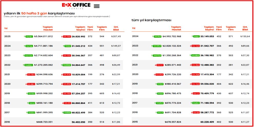 2025’te gişenin zirvesinde 2 milyon 455 bin seyirci ile Fransız filmi adaptasyonu “Yan Yana” yer alıyor. İkinci sırada 2,3 milyon seyirci ile yerli animasyon “Rafadan Tayfa: Kapadokya” bulunuyor. Bunları ise 1 milyon 7 bin seyirciyle “Bir Minecraft Filmi” takip ediyor. 2025 senesinde en çok seyredilen 10 filmin yedisinin yerli yapım olduğu görülüyor. Bu rakamlar, beyazperdede yerli alışkanlığının değişmediğini gösteriyor.