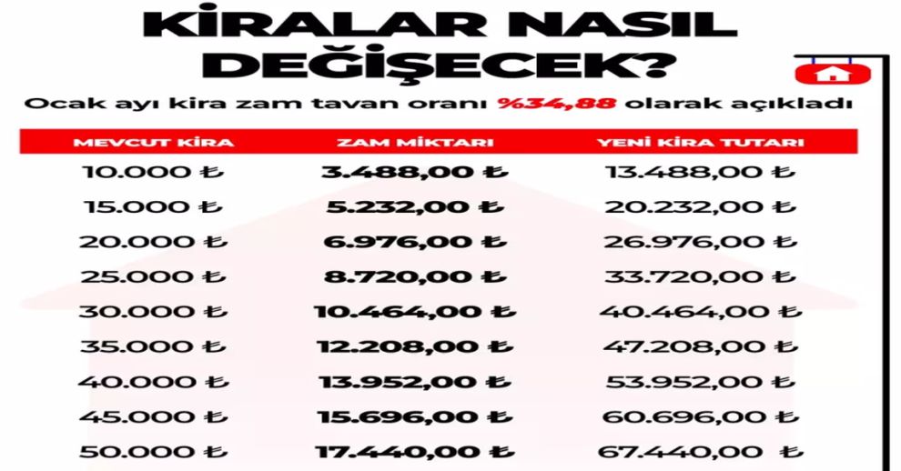 12 aylık enflasyon ortalamasına göre hesaplanan kirada tavan zam oranı ortaya çıktı.